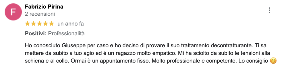 Ciao, sono Giuseppe Massaggiatore professionista, ed il mio obiettivo primario è far raggiungere il massimo stato di benessere a tutti i miei clienti.